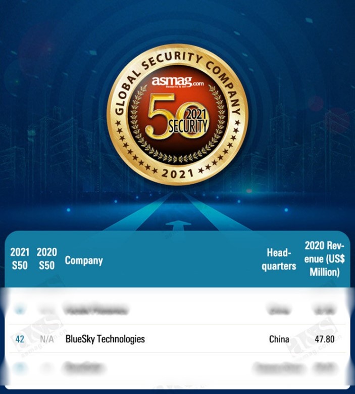 1月18日,国际知名安防媒体“a&s 传媒”发布2021全球安防50强榜单,这项排名是由a&s传媒编辑团队针对全球安防行业内拥有强大影响力的上市公司,就其2020年安防产品销售收入进行排名。蓝色星际凭借过硬的产品质量和技术实力、丰富的项目以及产品定制化经验、完善的软硬件一体化服务能力,排名全球第42位。