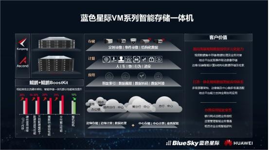 蓝色星际作为一家多年来深耕金融安防行业,立足客户实际业务场景,积极探索智能安防物联管理平台应用的技术厂商,本次会议联合华为发布了面向金融行业的智能应用一体化存储产品-蓝色星际VM系列智能存储一体机。该产品基于鲲鹏+鲲鹏BoostKit+昇腾的架构开展技术创新应用,结合蓝色星际自主研发的VM分布式存储系统、多场景智能算法及智能化应用服务,实现软硬协同,打造集存储、计算、业务对接于一体的高性能分布式存储方案。